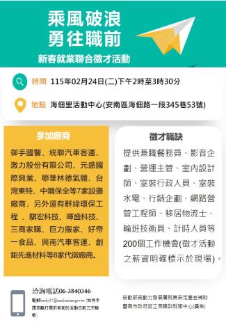 為打造黃偉哲市長「希望家園」的施政願景,勞工局積02月24日(二)下午2時至3時30分在海佃里活動中心(安南區海佃路一段345巷53號)辦理乘風破浪勇往職前新春就業聯合徵才活動,邀請15家廠商提供20 ...更多