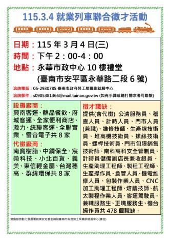 為打造黃偉哲市長「希望家園」的施政願景,勞工局積極辦理各項就業徵才活動,並因應產業求才需求,勞工局職訓就服中心將於115年3月4日(週三)下午2時至4時在永華市政中心10樓禮堂(臺南市安平區永華路二段 ...更多