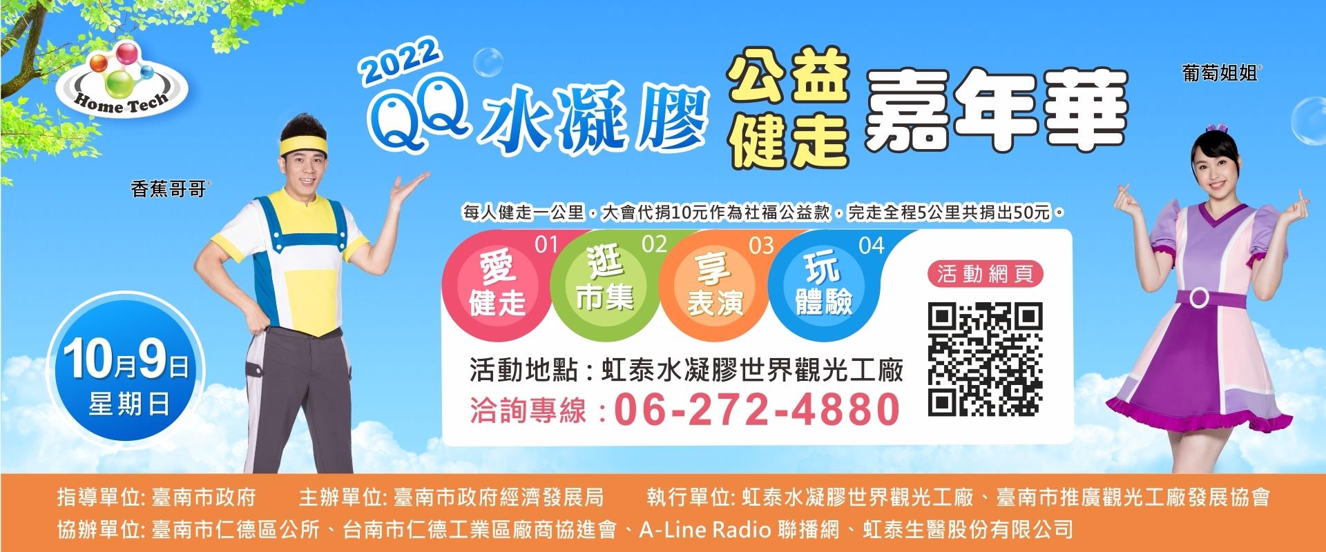 由臺南觀光工廠攜手推出「2022 QQ水凝膠 公益健走嘉年華」,將在2022年10月9日(日)8:00~16:00虹泰水凝膠世界觀光工廠盛大舉行,一共規劃愛健走、逛市集、享表演、玩體驗四大主題活動,歡迎大家共襄盛舉!