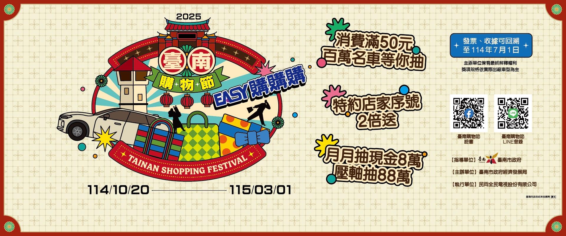 2025臺南購物節活動期間自114年10月20日至115年3月1日止(發票、收據憑證追溯至114年7月1日起),消費者在本市店家消費,登錄活動官網或購物節官方LINE,累計滿50元就有機會獲得現金、百萬名車等多項好禮。