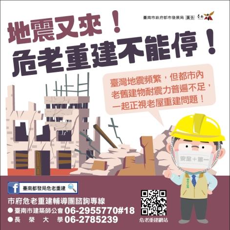 發稿單位:都市發展局 發稿時間:111年9月26日15:15 近期臺灣大小地震不斷,臺東池上發生規模6.8的地震,造成部分地區災損,市府關心市民居住安全,提供自主都市更新、危老重 ...更多