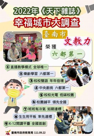 天下雜誌日前公布2022幸福城市大調查,臺南市在文教力表現方面,獲評比為六都第一,且為全國第一。臺南市長黃偉哲表示,感謝市民對城市的認同,在當今少子化趨勢下,挹注充裕資源於教育,是政府責無 ...更多