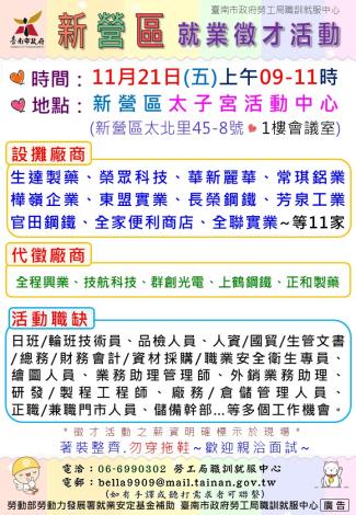為打造黃偉哲市長「希望家園」的施政願景,勞工局積極辦理各項就業徵才活動,並因應產業求才需求,勞工局職訓就服中心將於11月21日(週五)上午9時至11時在新營區太北里45-8號1樓會議室(新營區太子宮活 ...更多