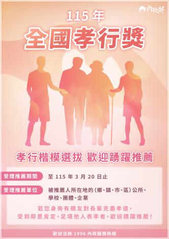 發稿單位:民政局 發稿時間:115年1月22日13:55 內政部為弘揚孝道倫理,藉以敦風勵俗,並表彰孝行楷模,每年均舉辦全國孝行獎選拔,115年全國孝行獎預定選拔30位孝行楷模, ...更多