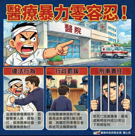 醫療機構是守護民眾生命健康的神聖殿堂,醫事人員更是在第一線與病魔搏鬥的英雄。然而,過往發生的醫療暴力事件,不僅傷害了醫護同仁的身心健康,更嚴重干擾正常的醫療秩序與患者服務。臺南市政府衛生局今(21 ...更多