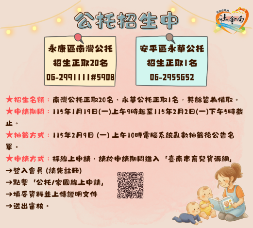 為提升本市公共托育服務量能,臺南市政府社會局運用永康區多功能活動中心3樓(臺南市永康區立興街83號)空間,設置公設民營托嬰中心,提供平價、優質托育服務,預計3月1日起正式收托,刻正受理報名中。凡嬰幼兒 ...更多