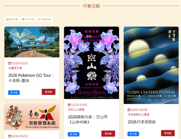 「2026臺南行春」一站掌握逾百項活動與吃喝玩樂 為便利民眾規劃春節與元宵連假旅遊行程,臺南市政府觀光旅遊局彙整逾百項春節活動,建置「2026臺南行春」網站,整合春節及元宵期間全市重要展覽、演藝、活動、花海、導覽活動、燈會、交通等資訊,並串聯交通局即時交通資訊網,同時彙整民政局提供的各區重要代表寺廟及相關年節活動,讓民眾一站掌握臺南過年期間最完整、最即時的旅遊與走春資訊,輕鬆安排豐富又安心的新春行程。