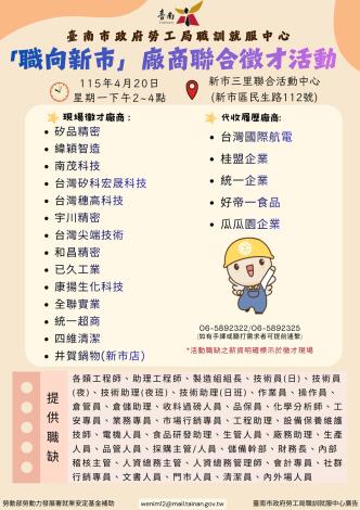 為打造黃偉哲市長「希望家園」的施政願景,勞工局積極辦理各項就業徵才活動,並因應產業求才需求,勞工局職訓就服中心將於4月20日(一)14時至16時在新市區三里聯合活動中心(新市區民生路112號)辦理「職 ...更多
