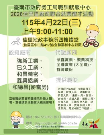 為打造黃偉哲市長「希望家園」的施政願景,勞工局積極辦理各項就業徵才活動,並因應產業求才需求,勞工局職訓就服中心將於04月22日(三) 9至11時在佳里地政事務所四樓禮堂(佳里區中山路417號/全聯中山 ...更多