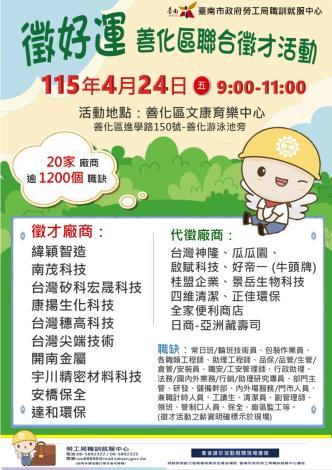 為打造黃偉哲市長「希望家園」的施政願景,勞工局積極辦理各項就業徵才活動,並因應產業求才需求,勞工局職訓就服中心將於04月24日(五)9時至11時在善化文康育樂中心(臺南市善化區進學路150號-善化游泳 ...更多