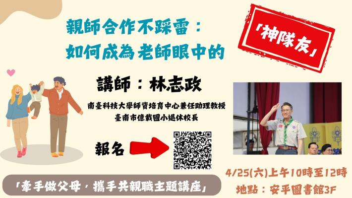 面對孩子的校園生活,家長該如何與學校建立信任感?為了搭起親師合作的黃金橋樑,透過臺南市家庭教育中心「牽手做父母,攜手共親職」講座,特別邀請擁有豐富經驗的林志政校長,帶領家長從校務與教學的第一線視角,掌 ...更多