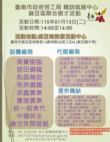 為打造黃偉哲市長「希望家園」的施政願景,勞工局積極辦理各項就業徵才活動,並因應產業求才需求,勞工局職訓就服中心將於01月13日(二)14:00至16:00時在麻豆南勢里活動中心(臺南市麻豆區南勢里16 ...更多