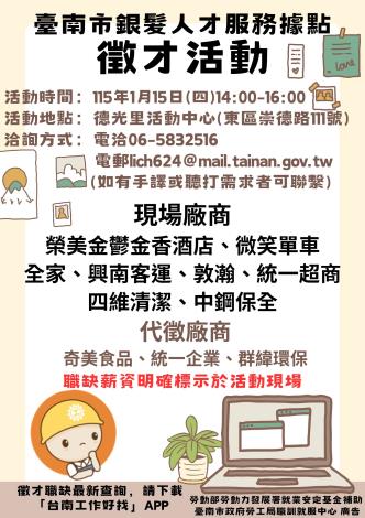為打造黃偉哲市長「希望家園」的施政願景,勞工局積極辦理各項就業徵才活動,並因應產業求才需求,臺南市銀髮人才服務據點將於1月15日(四)下午2點至4點舉辦聯合徵才活動,地點於德光里活動中心(臺南市東區崇 ...更多