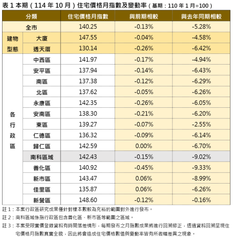 114年10月臺南市住宅價格指數為140.25,較前期(9月)微幅下降0.13%,相較去年同期則小幅下降5.28%。以住宅型態而言,本期大廈的價格指數為147.55,透天住宅的價格指數為130.1 ...更多