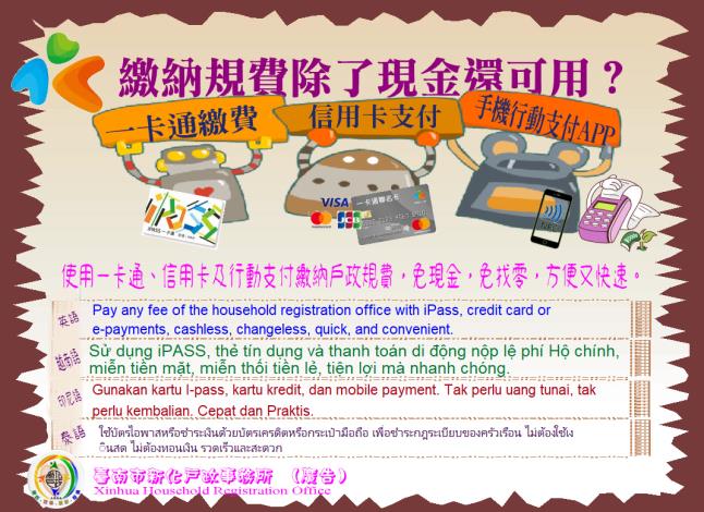 歡迎民眾使用一卡通、信用卡、行動支付、台灣pay掃一下繳納戶政規費,免帶零錢,可提升生活便利性,請多加利用。