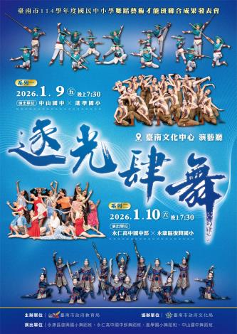 「逐光肆舞」臺南市114學年度舞蹈藝才班聯合展將於1月9日及10日在臺南文化中心演藝廳舉辦,教育局長鄭新輝率領永仁高中國中部、中山國中、永康區復興國小及進學國小4校舞蹈班校長與學生共同入鏡拍攝宣傳影片 ...更多