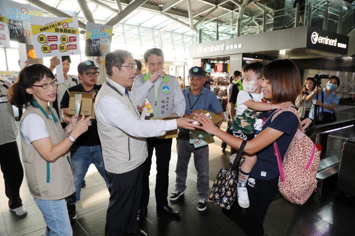 為防範登革熱,黃市長親至高鐵台南站仁發送防疫傳單、菜瓜布及防蚊液等宣導品,呼籲民眾外出及烤肉時應穿著淺色長袖衣褲,身體祼露的部份記得要塗抹衛福部核可的防蚊藥劑,烤肉後也要隨手清理垃圾及空瓶,做好居家戶內外環境孳清,市長表示,中秋佳節外地遊子紛紛返鄉,市府非常歡迎大家回到台南團圓過中秋,目前台南市登革熱疫情已控制得相當不錯,也獲中央疾管署的肯定,但面對登革熱,市府秉持「料敵從寬、禦敵從嚴」,對於防疫工作絕不怠慢,再次提醒各位市民,務必要做好「巡、倒、清、刷」基本功。