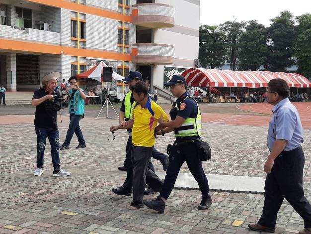 此外,因應近年校外人士入侵校園危安事件,特於本次示範演練中模擬外人入侵校園,學校啟動緊急應變處置並與校外人士斡旋,通報警方派員協助,帶離該名校外人士。期盼透過本次演練強化校園非法入侵事件應變作為,提高師生防範、自救、互救之意識與能力。