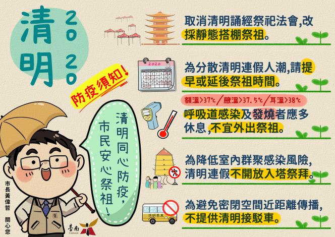 清明節為國人掃墓祭祖重要節日,於國內外各地民眾將陸續返鄉祭祖幾乎成為全民運動,今年清明節於為4月4日,於4月2日至5日屬連續假期,屆時將湧現大量人潮掃墓祭祖,如到公墓屬開放性空間尚無防疫上問題;如果到納骨塔(堂)祭祖會進室內祖先櫃位、牌位前合十祭拜,屆時室內將湧入大量人潮且持續時間較長,可能增加呼吸道傳染病之傳播風險,國內嚴重特殊傳染性肺炎COVID-19(武漢肺炎)確診個案數持續增加尚未趨緩,為降低民眾感染嚴重特殊傳染性肺炎風險,市長黃偉哲要求各管理機關確實依中央流行疫情指揮中心制定之「『嚴重特殊傳染性肺炎』因應指引:公眾集會」落實辦理外,並採取下列因應措施: