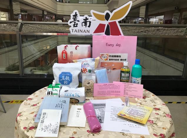 防疫關懷包中,除黃偉哲市長關懷信、安心卡、隔離及檢疫者須知文宣外,也備有口罩、漂白水、體溫計、專用垃圾袋等基本防疫用品;另有慈濟基金會提供的五穀粉、米果、腰果、香積飯、威德果凍、靜思語以及三皇生物科技所提供的生活運動飲料,共同發揮公私協力的關懷力量。
