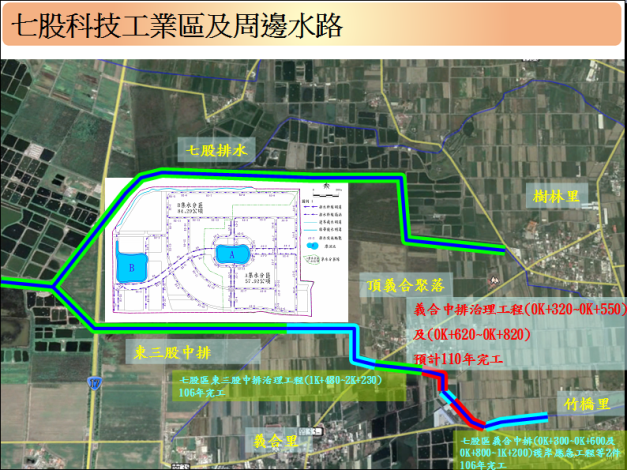 七股科業工業區位於台17省道旁,為劉厝排水系統支流七股排水及東三股中排流域,開發區上游涉及七股區竹橋里及西港區永樂里等區域,主要為東三股中排上游之義合中排集水區。鑒於為利推動沿海地區經濟發展,以及減低七股科技工業區開發後對周邊區域防洪能力影響,本府即依據規劃報告針對園區周邊排水系統通盤檢討,位於開發區段之排水現況業已符合治理計畫,然針對上游段鄰近社區渠段,通洪能力尚待辦理改善,爰為利經濟開發與治水防洪併行推動,黃偉哲市長即指示水利局應積極爭取改善經費,以利溪北沿海地區地方發展。