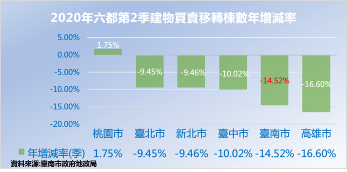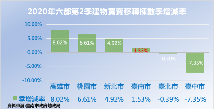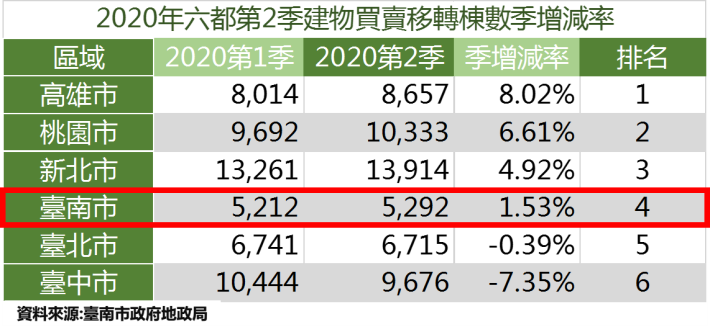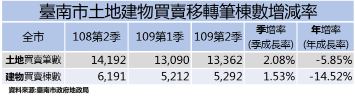臺南市109年第2季不動產交易統計出爐,本季土地移轉13,362筆,建物買賣移轉5,292棟,與前一季(109年1至3月)相較,土地交易筆數增加272筆,增加2.08%;建物交易增加80棟,增幅1.53%。本季雖仍處於新冠肺炎疫情期間,但土地及建物成交量均同步微幅增長,惟與去年第2季土地移轉14,192筆、建物移轉6,191棟相較,仍屬於交易量縮的情況。