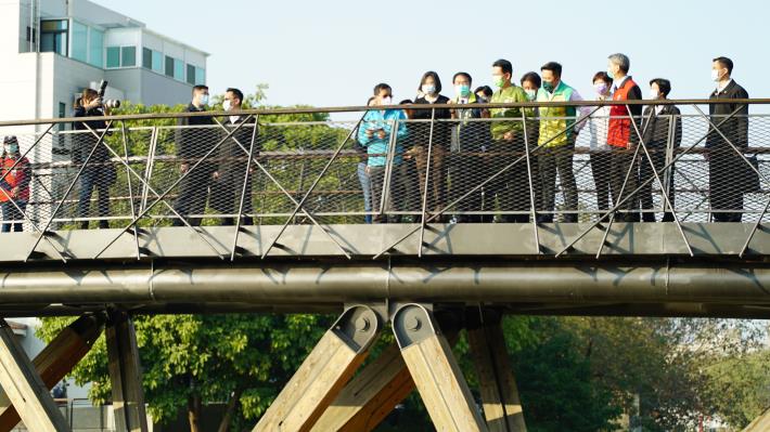 兩條軸線的交會點是嶄新的月見橋,猶如半月般的弧形設計,在湖域上勾勒美麗的弦月,橋面與河岸景緻合而為一,夜間映著月光倒影,是竹溪計畫中最耀眼的亮點。