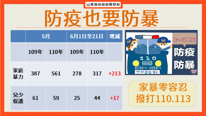 警察局長方仰寧表示,統計110年比109年同期的5月至6月21日期間,在家庭暴力部分增加213件,兒少保護增加17件,防疫期間由於居家防疫相處時間增加,易發生管教態度問題等暴力事件,防疫也要防暴,因此,南市府對於家庭暴力及兒少保護也依規定受理通報,報請社政及衛生單位處理,也提醒大家,若有聽聞家暴及兒虐案件,請主動撥打110或113通報警方,以防憾事發生。