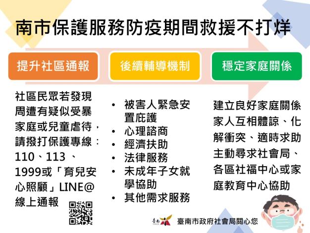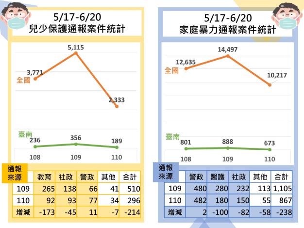 針對兒少保護及家庭暴力通報部分,社會局長陳榮枝指出,以5月17日至6月20日統計,兒少保護通報案件110年比109年減少214件,家庭暴力通報案件減少238件,惟市長黃偉哲擔心有未被通報的存在,希望防疫期間透過宣導來保護服務,救援不打烊,提供社區通報部分,社區民眾若發現周遭有疑似受暴家庭或兒童虐待,請撥打保護專線:110、1999或「育兒安心照顧」LINE@線上通報,來增強通報,後續在輔導機制面上,提供被害人緊急安置庇護、心理諮商、經濟扶助、法律服務、未成年子女就學協助及其他需求服務。