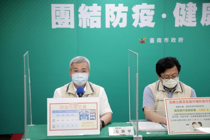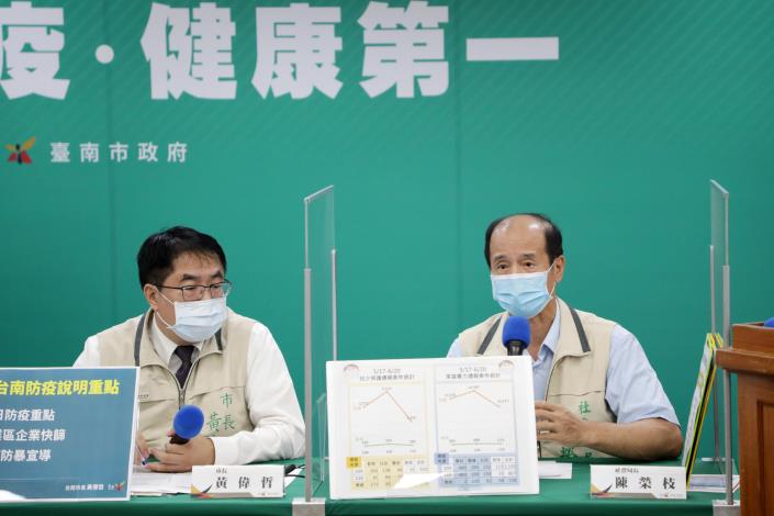 台南市長黃偉哲在今(22)日下午的防疫記者會,偕同社會局長陳榮枝及警察局長方仰寧向市民報告防疫期間家庭暴力防治宣導及照顧獨老措施,讓市民隨時掌握相關資訊。