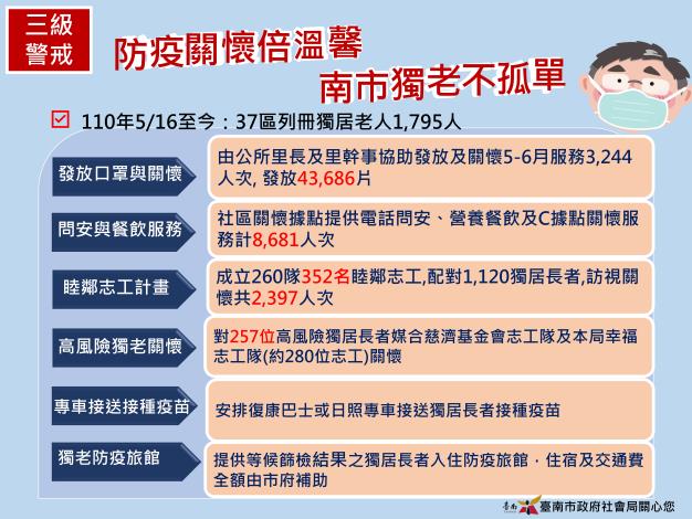 高風險獨居關懷部分,對257位高風險獨居長者媒合慈濟基金會志工隊及本局幸福志工隊關懷。南市也會安排復康巴士或日照專車接送獨居長者接種疫苗,而獨居防疫旅館提供等待篩檢結果之獨居長者入住防疫旅館,住宿及交通費全額由市府補助,希望防疫期間關懷獨老可以加倍溫馨。