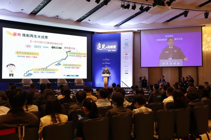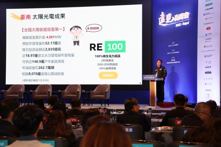 黃偉哲指出,為使科技產業持續保持競爭力,因應全球淨零碳排趨勢,台南是全國發展再生能源最多的城市,備案的裝置容量已經超過4.05MW(Megawatt),預估年發電量超過約52億度,相當於每年約有18.9座曾文水力發電廠發電量,可供近148.9萬戶年家庭用電;同時台南雖然坐擁數個水庫,但由於農業發達,用水相對可觀,為兼顧農業、民生及產業用水,積極發展再生水是不二法門,台南成為全國提供最多再生水給半導體產業的城市。他強調,台南的城市治理不僅發展這世代的產業,同時為下一代保護環境永續。