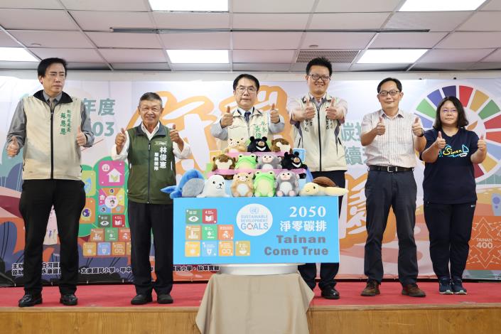 今日的標章認證頒獎典禮開場,由黃偉哲市長與在場嘉賓共同轉動「2050淨零碳排」轉盤,象徵台南市透過低碳校園認證標章,推動從學校、社區到個人的低碳生活實踐,達成2050淨零碳排目標。