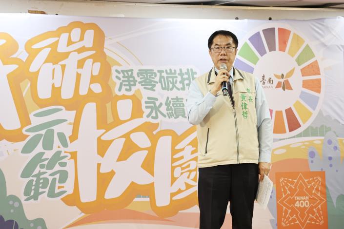 黃偉哲恭喜今年通過低碳校園標章認證的76個學校,感謝他們為地球盡一份心力。他也提到,今年「臺南市淨零永續城市管理自治條例」草案已送議會審查,期盼審議通過後,該條例能成為台南市朝向低碳、淨零的規範準則。
