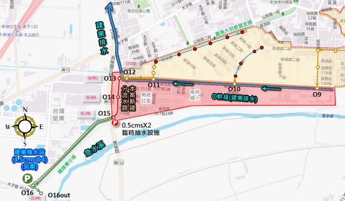 水利局說明,為全面健全當地排水體系,市府亦同步規劃於新營建業O幹線下游設置每秒抽水量18噸之建業抽水站,目前已完成用地盤點及可行性評估,持續辦理用地取得、都市計畫變更及爭取中央補助工程經費,將來抽水站與O幹線下水道系統整體串聯完工後,將可於豪大雨期間發揮即時抽排效益,進一步強化區域防洪能力。