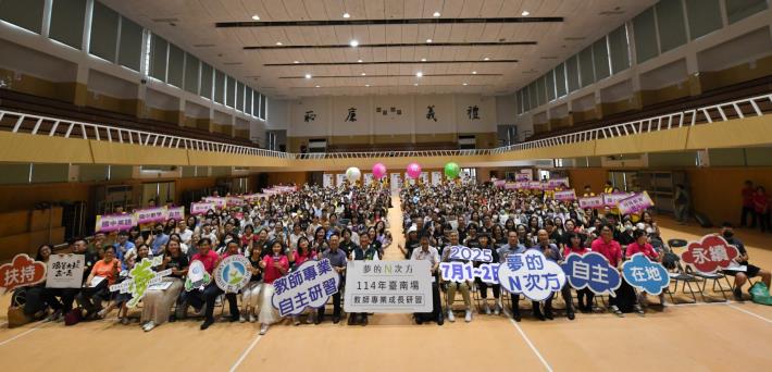 每年暑假全國第一場國中小教師專業自主增能研習—114年度「夢的N次方」教師專業自主社群多元工作坊今、明(1、2)兩日如常於國立臺南二中熱烈舉行。臺南市教育局局長鄭新輝及團隊熱烈歡迎來自全國700位熱血教師歡聚臺南,教育部國民及學前教育署署長彭富源及夢N發起人爽文國中教師王政忠全程參加開幕儀式,期勉全體講師及學員們找到夥伴、找齊資源、找對方向,用數位融入開創一條屬於自己的教學坦途。