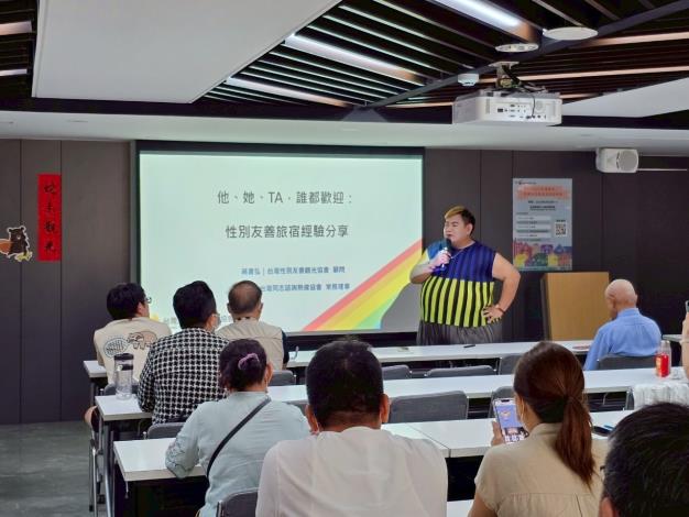 這場說明會由專家團隊詳細介紹「性別友善旅宿」的意義、評估標準及申請流程,讓旅宿業者充分瞭解如何打造一個不分性別、性取向,人人都能自在入住的住宿空間。認證指標由國立高雄餐旅大學、台灣性別友善觀光協會、台南新芽協會、台南市民宿文化發展協會等產官學三方共同研擬,並涵蓋空間設施、服務品質、從業人員教育訓練、旅宿業經營政策等面向,兼顧服務可行性及實際需求,確保安心、尊重、友善的理念落實於旅宿業。說明會同時也邀請台灣同志諮詢熱線協會蔣書弘常務理事,用生動活潑方式分享性別友善旅宿經驗,獲得滿場旅宿業者熱列迴響。