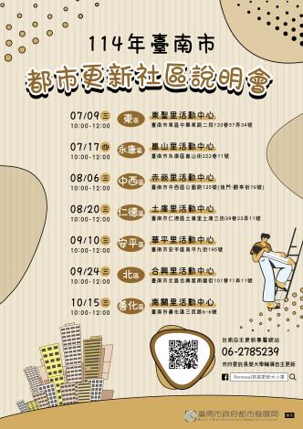 說明會場次已公布於「臺南市政府自主更新專區」,歡迎民眾踴躍報名參加,自主更新說明會可至網頁查詢詳細內容與說明會場次安排(網址:https://www1.cjcu.edu.tw/cled/tainan002/file/course3.html)。
