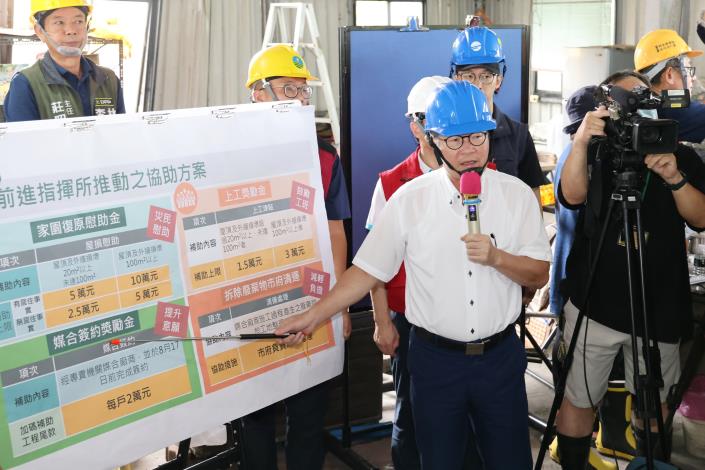 卓榮泰說,具有低收、中低收入身分的災民房屋修繕,將由政府統一處理,災民不需要支出任何費用。此外也請經濟部發起電器廠商的捐助活動,不僅在修復、檢查電器修復的過程當中,能夠給予災民折扣,更希望廠商能對低收或中低收入戶的災民,捐贈包括冷氣機、洗衣機、除濕機等設備,幫助災民完成家園的重建。