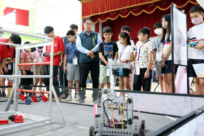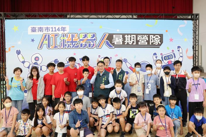 AI浪潮來襲,機器人成為孩子暑假中的科技新夥伴,台南市教育局今年暑假首度推出AI機器人營隊,規劃5梯次、依國小至國中分齡設計,每梯次3天的密集課程,結合程式設計,培養學生運算思維與跨域整合能力。今(14)日在新營國小舉辦第4梯機器人營隊,市長黃偉哲到場致詞,教育局長鄭新輝、新營國小校長曹欽瑋、石門國小校長劉珍琳、建功國小校長黃郁雯也到場關心,黃偉哲與學生操控機器人交流心得,氣氛相當熱絡。