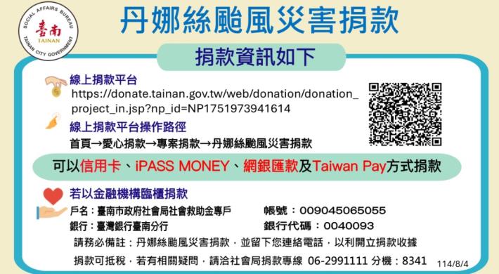 黃偉哲市長表示各災區災後復原工作亟需經費協助,為便利廣大民眾發揮愛心幫助賑災,本府自7月8日起以臺南市社會救助金專戶線上捐款平台及「臺南市政府社會局社會救助金專戶」臨櫃匯款,兩種方式作為收受丹娜絲颱風災害捐款管道,後續捐款將統一結轉存入「臺南市政府重大災害賑災捐款專戶」,供丹娜絲颱風災害復原及重建使用,截至8月22日止,丹娜絲颱風災害捐款收入總計新臺幣1億7,370萬8,167元,對於各界踴躍捐輸、共襄善舉,市府表達誠摯感謝之意。