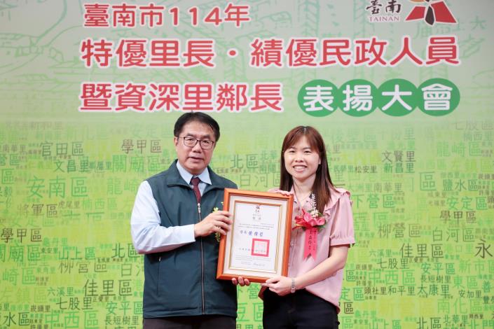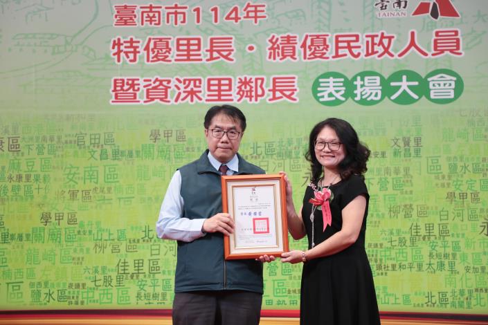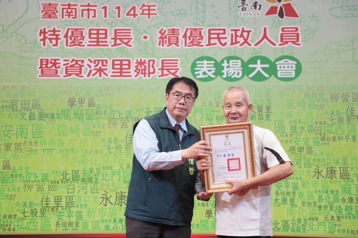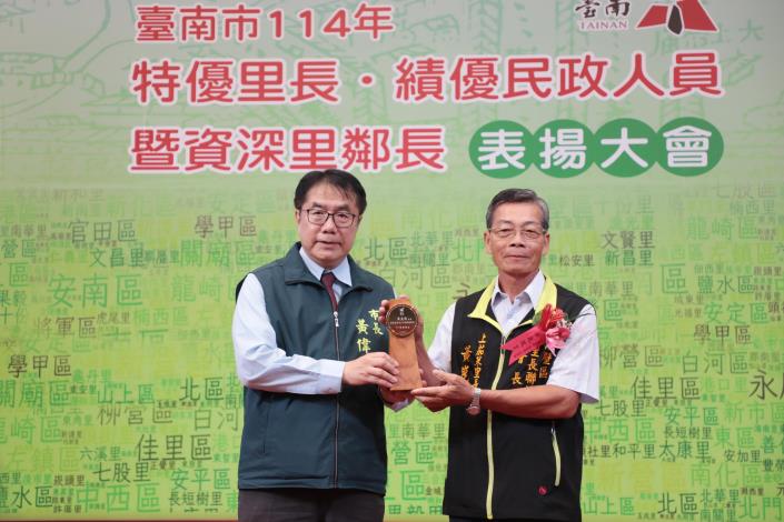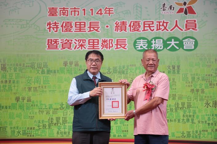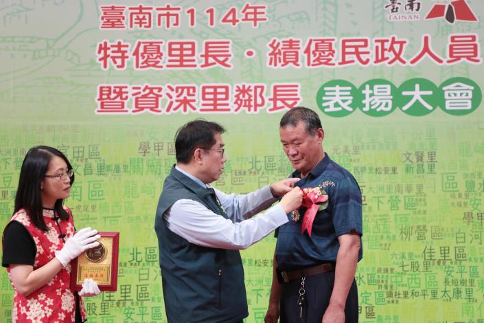 台南市政府今(28)日上午於安平區福爾摩沙遊艇酒店舉辦「114年特優里長、績優民政人員暨資深里鄰長表揚大會」,由市長黃偉哲親自頒獎予148名獲獎里鄰長,肯定他們長期投入基層服務、守護市民的無私奉獻。