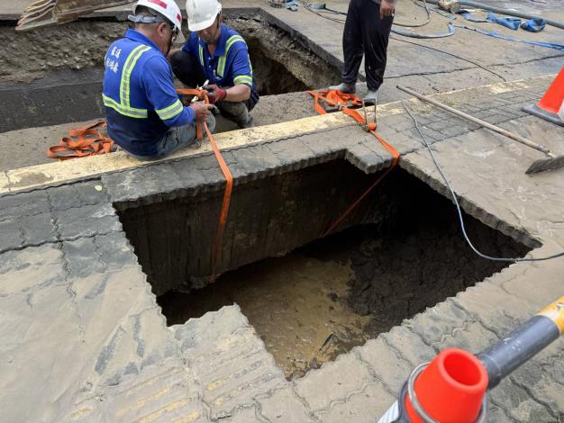 工務局表示,自來水公司8點到場後進行開挖,發現是250mm舊水管管裂開,該幹管為主要調水幹管,裂開約1公尺,水流出造成沖刷土石路基流失,AC路面掏空及人行道受損範圍約長25公尺,寬約2公尺長,2公尺深,自來水公司已全力進行搶修。