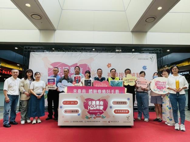 為實踐臺南市長黃偉哲「希望家園」的施政願景,打造一座關懷與幸福並重的友善城市,今(6日) 於南紡購物中心5樓夢想舞台舉辦「手護臺南 Hand有愛」視障按摩據點行銷活動熱鬧登場!特邀知名藝人徐凱希現身力挺視障按摩,期盼民眾透過實際行動支持視障按摩師穩定就業。