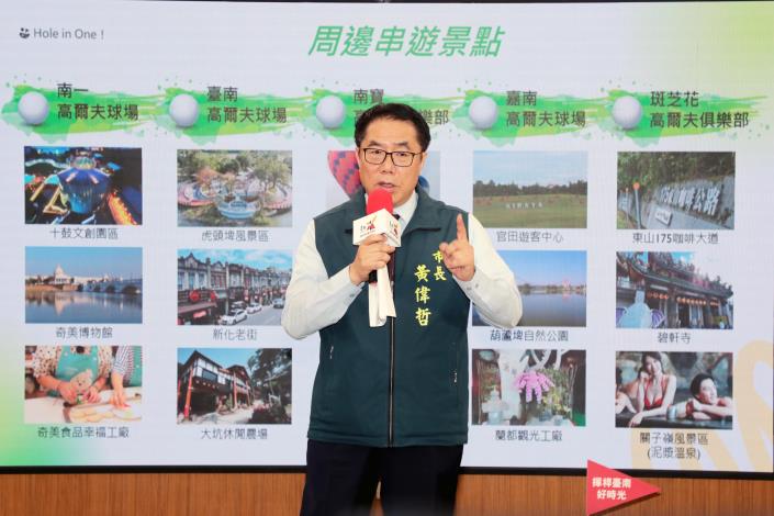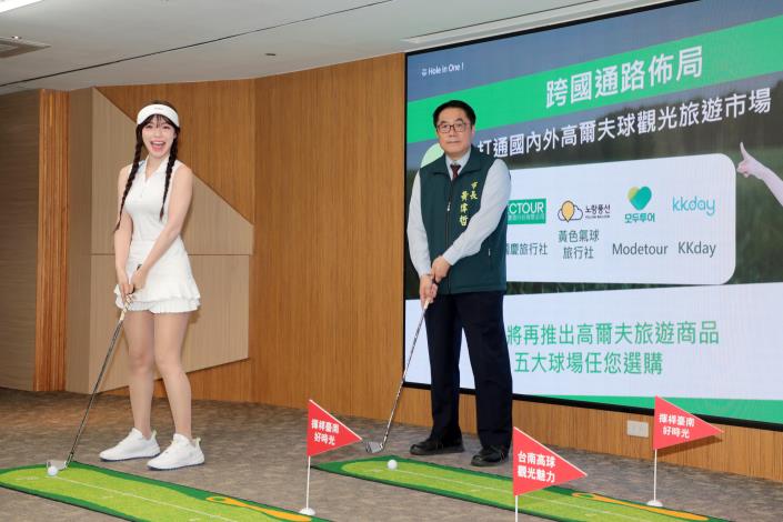 觀光旅遊局長林國華進一步說明,今年以「Hole in One!」為主題,不僅與國內外大型旅遊平台合作販售高爾夫球遊程,更邀請超人氣啦啦隊員李多慧來台南走訪五大高爾夫球場,體驗安平古堡、仙湖農場、深緣及水善糖文化園區、虱目魚主題館等台南知名景點,並品嚐東山咖啡、牛肉湯、安平豆花、海產等在地美食,期透過名人踩線體驗後,吸引更多國內外好朋友分享台南高爾夫球遊程的獨特魅力,打造台南為國際旅客安排高爾夫球遊程的首選城市。