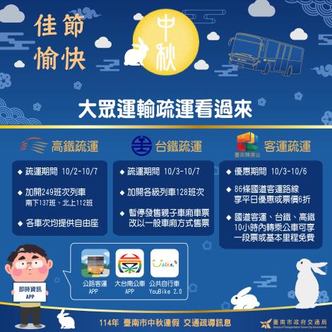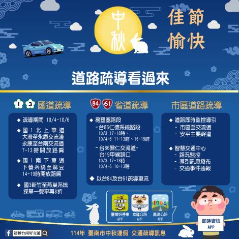 中秋節(10/4~10/6)及國慶日連假(10/10~10/12)自本週六開始,台南市市長黃偉哲籲請市民朋友返鄉出遊前可先做好行程規劃,並責成交通局等相關單位持續監控易壅塞路段、即時發布改道訊息及調整塞車道路號誌,請用路人配合警方疏導,避開可能擁擠路段,節省旅行時間。