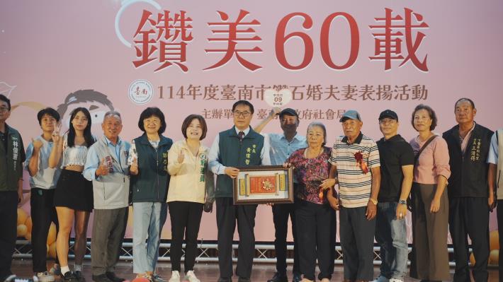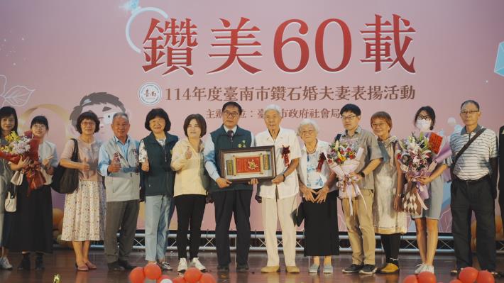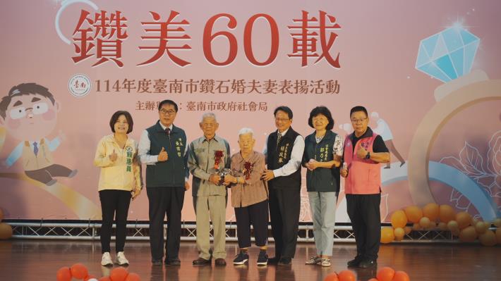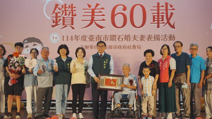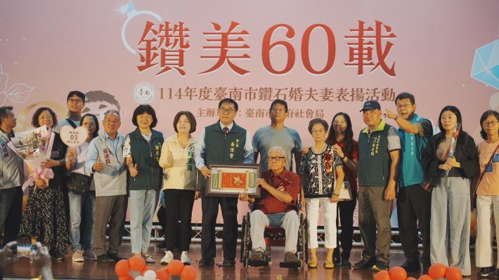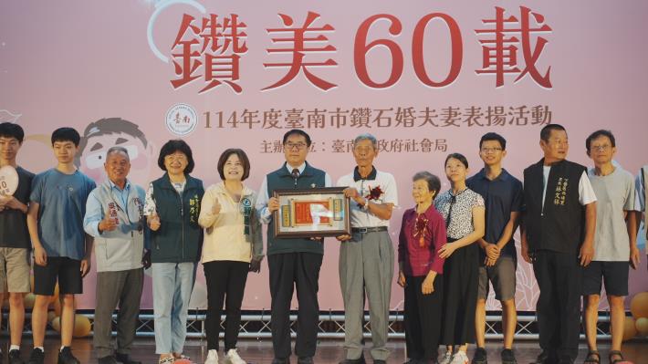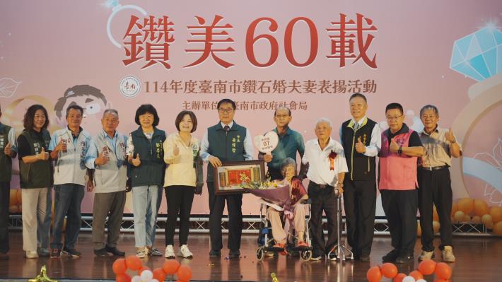 10月為重陽敬老月,台南市政府社會局今(18)日上午於民治市政中心南瀛堂舉辦「114年度台南市鑽石婚夫妻表揚活動」,由市長黃偉哲親自頒贈匾額並獻上祝福,表揚33對婚齡超過60年的鑽石婚夫妻,感謝他們以真摯情感與堅定承諾,樹立世代相傳的家庭典範。