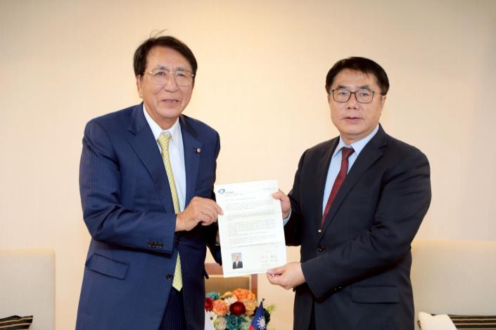 白山市議會一創會藤田政樹會長表示,台南市與石川縣因八田與一技師而有深厚的情誼,雙方的水利會過去曾進行交流,近年來鄰近的金澤市也年年造訪台南,感謝台南一直以來的支持,也希望能邀請台南市的各位造訪白山市。藤田會長提及,此行參觀了台南的學校與科技園區,很希望未來能推動彼此在教育、科技、經濟方面的交流。藤田會長也轉交白山市田村敏和市長的信給黃偉哲市長。