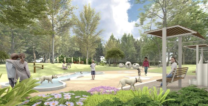地政局長陳淑美指出,二期公園面積15公頃相當於一座台南公園,是永康探索公園六公頃的2.5倍,為了讓珍貴喬木成為園區的特色之一,40米的康橋大道特別規劃以原生大樹為主軸的「綠蔭大道」,串聯主要出入口與公共空間。透過既有樹木的保留與生態配置,打造具遮蔭、通風與散步功能的友善步行環境。此舉不僅降低開發對環境的衝擊,也讓昔日的軍事校區轉化為充滿生命力的城市綠帶,象徵永康地區從工業走向創意的永續轉型。園區內另設有約1000坪的寵物公園,樹木密集、綠蔭成蔭,提供飼主與毛小孩一個舒適安全的休憩環境,成為都會區中難得的生態友善空間。
