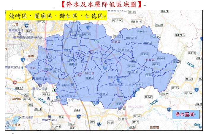 市府觀光旅遊局指出,根據臺灣自來水公司預估本次工程影響供水的區域包含永康區、安平區、東區、中西區、北區、玉井區、南化區、安定區、新化區、左鎮區、善化區、大內區、山上區、新市區、歸仁區、關廟區、龍崎區、仁德區等18個行政區,影響範圍甚大,籲請旅宿業先行儲水準備,並提醒旅客於停水期間節約用水,其影響區域及時間說明如下: